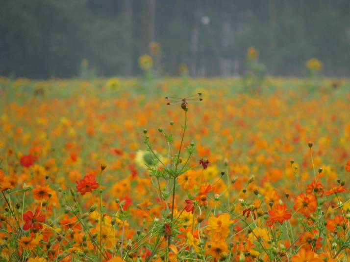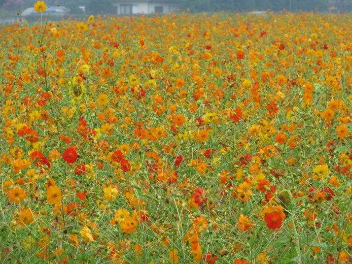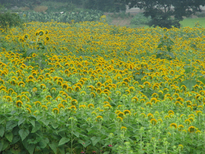 茨城県筑西市(旧明野町)にあるヒマワリの名所です。 ここでは、八重のヒマワリが一面に咲いています。 筑波山をバックにキバナコスモスとの競演が素晴らしいです。 当日は雨の降りそうな曇り空で筑波山がかすんでいました。